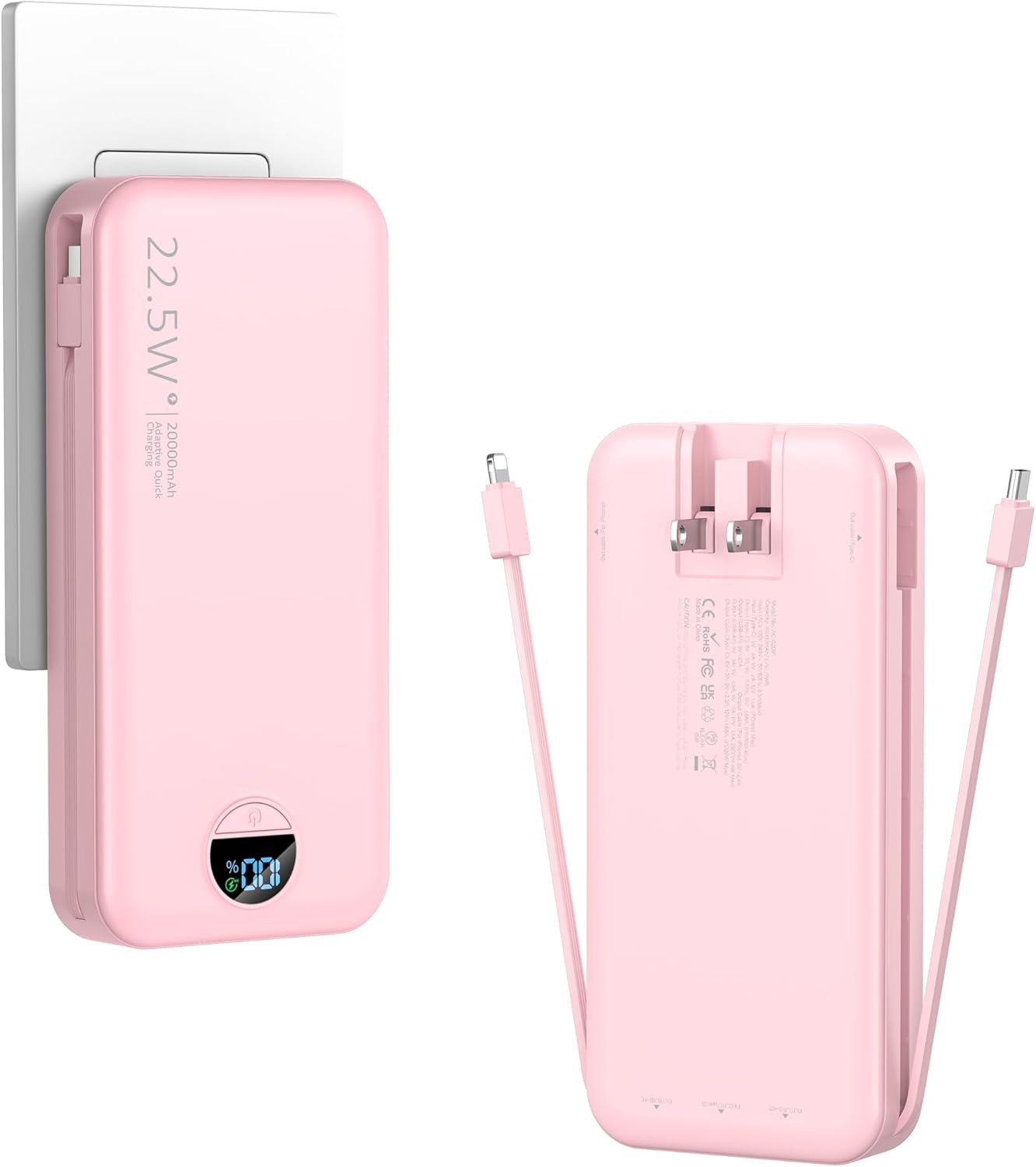 Portable Charger, 20000mAh 22.5W Fast Charging Power Bank with Built-in Cables & Wall Plug, External Battery Pack with LED Display, Travel Essentials Battery Bank for iPhone, iPad, Samsung Fairy Pink